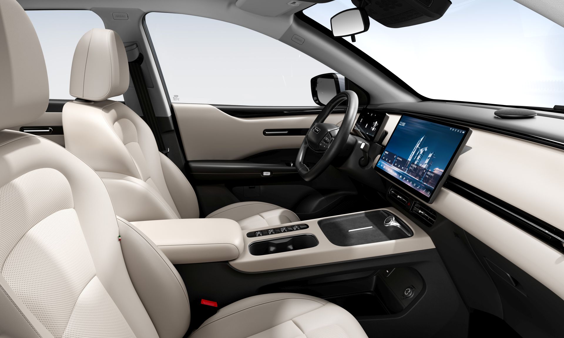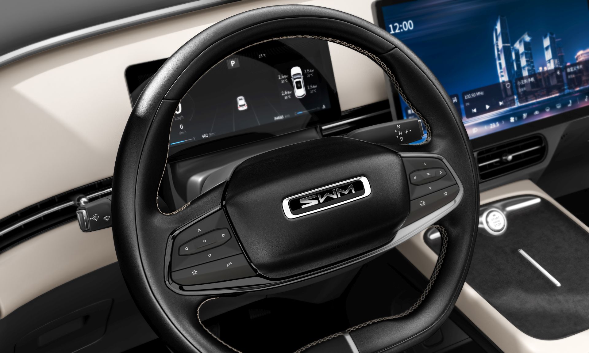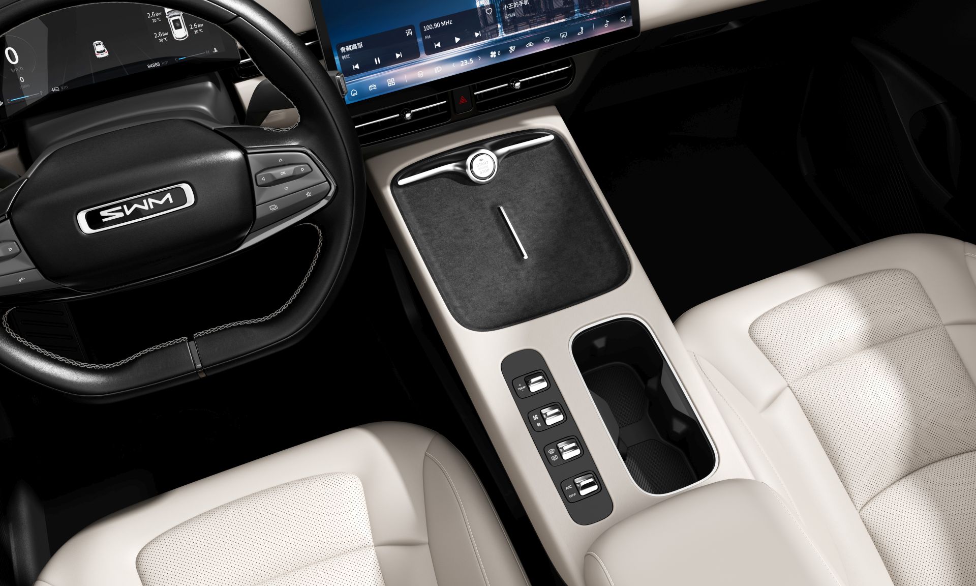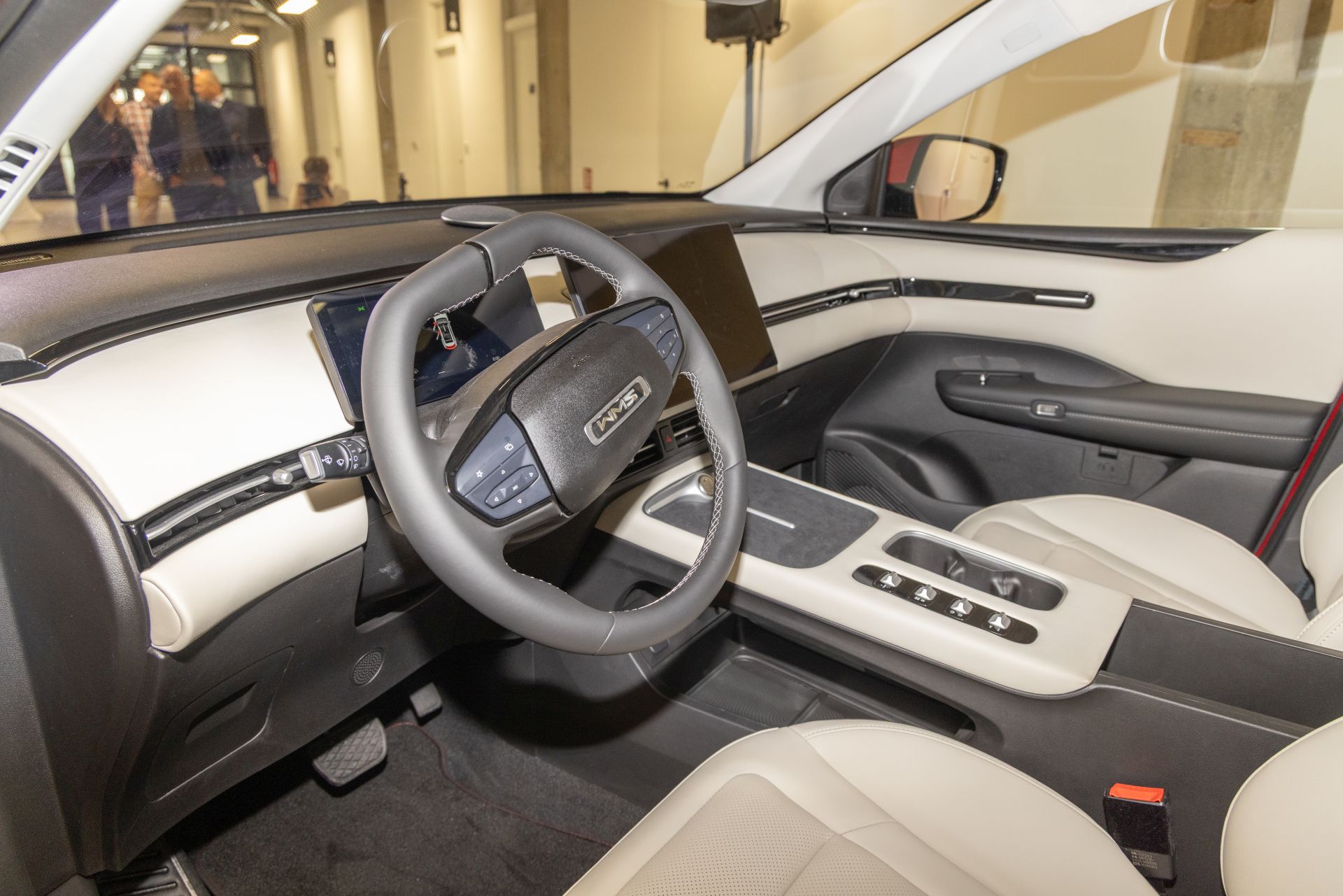 No a to jsme se zatím na auto dívali je zvenku, pojďme dovnitř, automobilka pro SWM G1 PRO nabízí jak černý, tak béžový interiér. Za nás určitě vede béžový, sice je náročnější na údržbu, ale autu prostě dokonale sluší. Jak je trendem dnešní doby, máte displej jak před volantem, tak na středovém panelu. Ten na středovém panelu je obrovský, má 14,6 palce, takže je velmi přehledný a zobrazené údaje jsou velmi dobře čitelné - obzvláště mapa navigace. Co nás opravdu potěšilo je česká lokalizace - vystavené auto s námi sice ještě komunikovalo anglicky, ale každým dnem bude hotová kompletní čeština pro auto, takže pro české zákazníky velmi dobrá zpráva.